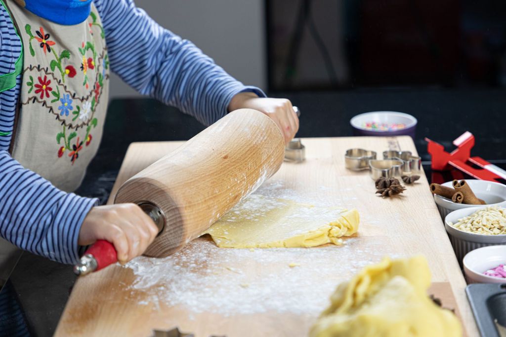 En la encimera colocamos papel de horno y azúcar glas o molido para que no se pegue la masa. Cogemos una porción de mazapán y con un rodillo lo extendemos. Se aplana hasta que quede un grosor menor a 3 milímetros para que no sea muy empalagoso.