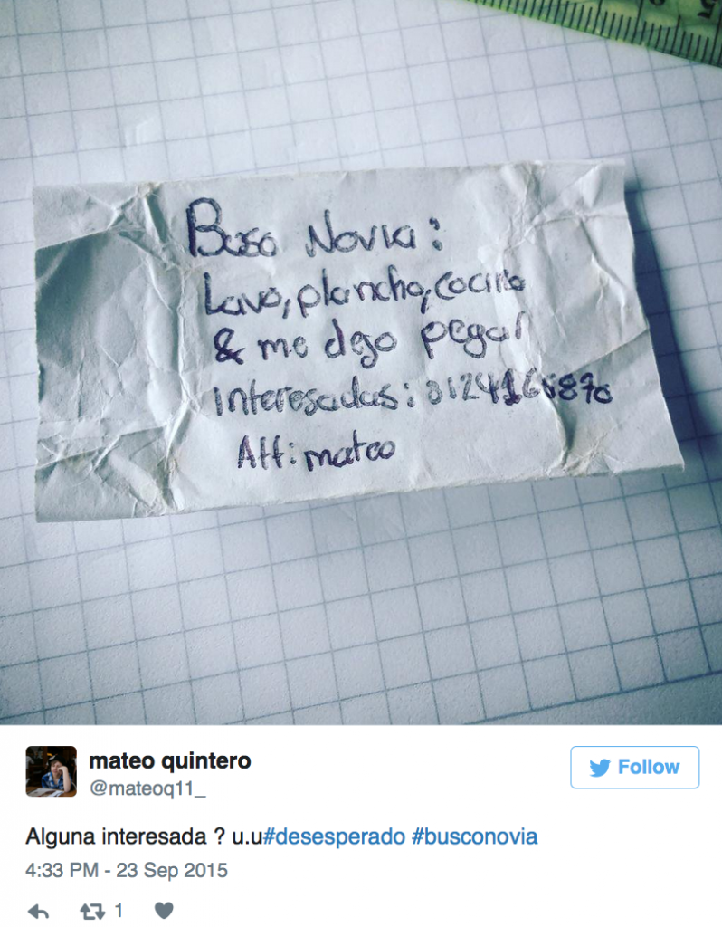 Porque no hay nada que recibir una nota de amor en clase, de alguien que busca novia desesperadamente. Eh, y hace lo que sea, hasta se deja pegar. Vamos, todo un chollo y un partidazo. Pero si está solo... por algo será. Este tal Mateo ha usado hasta Twitter para encontrar al amor de su vida. Pero lo que no sabe es que tal vez, el amor de su vida (o cualquier otra interesada), puede que no tenga Internet.