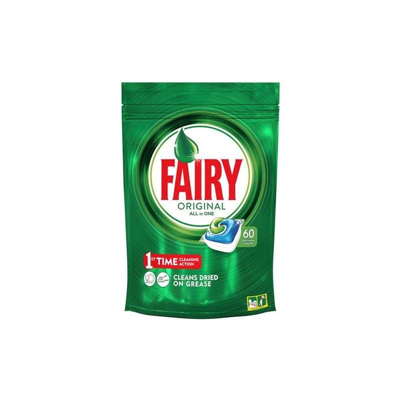 Fairy Original All in One Cápsulas ha aprobado raspado con un 52 sobre 100. A pesar de que es uno de los más caros, con un precio de 11,54 euros por 60 dosis, el producto no pasa la prueba de su "impacto medioambiental". Por otra parte, destaca en su eficacia de lavado y en sus instrucciones.