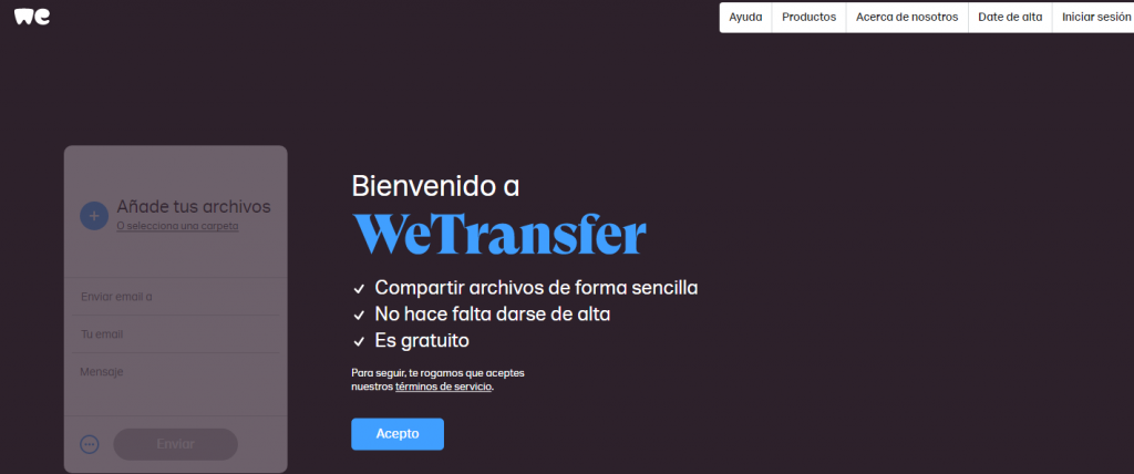 WeTransfer fue diseñado para compartir ficheros sin necesidad de registro. Es decir, puedes enviar y recibir archivos sin estar registrado en la plataforma, una característica que la diferencia de otras herramientas como Google Drive o Dropbox.
