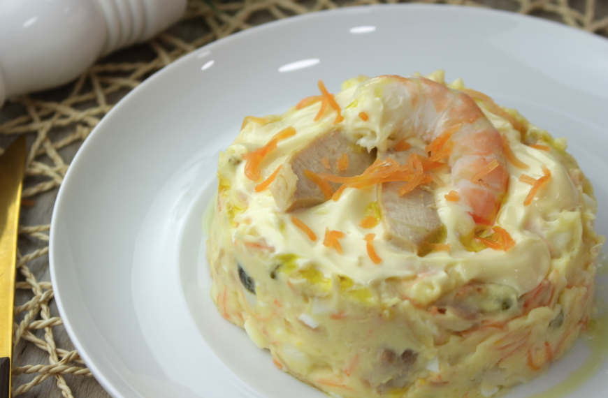 Es una versión de la mítica ensaladilla rusa, a la que se le pueden echar gambas o langostinos. Es clásica, sí, pero también fácil de hacer, nutritiva y muy sabrosa. Y es que este es un plato que suele gustar a toda la familia, así que coloca un buen plato de ensaladilla presidiendo la mesa y acertarás.