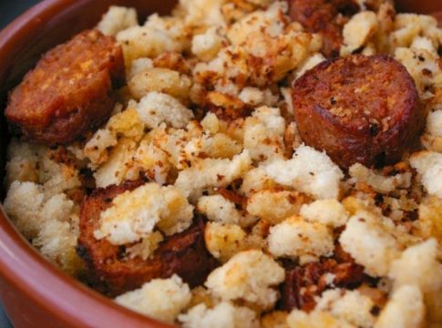 - Para ir culminando, debes añadir las migas de pan y remover mientras fríen durante unos 5-10 minutos. Notarás que están listas cuando hayan comenzado a cobrar un tono dorado, pero debes tener cuidado de que queden crujientes y no secas.