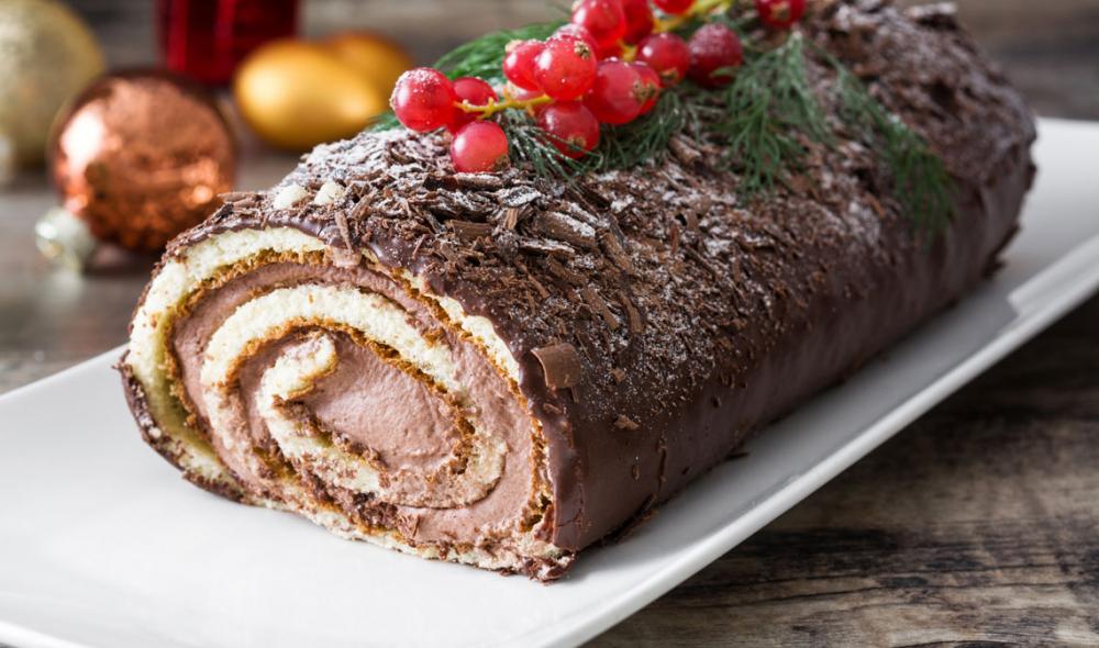 El pastel de leña de Navidad o Buche de Noel está hecho de un bizcocho ligero que se enrolla en un rollo y se rellena con crema batida o relleno de queso crema. En términos simples, es un pastel de rollo o un pastel de rollo suizo que se ha decorado para que parezca un tronco de Navidad y se sirve durante la temporada navideña.