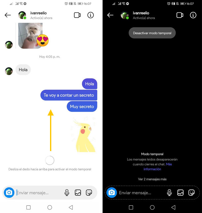 Esto quiere decir que puedes seguir usando los recursos de Instagram para comunicarte como los GIF animados, las fotos, los stickers e incluso puedes seguir realizando videollamadas. Sin embargo, sí que hay una única diferencia y es que el chat nos avisa de si alguno de los participantes en la conversación realiza una captura de pantalla.