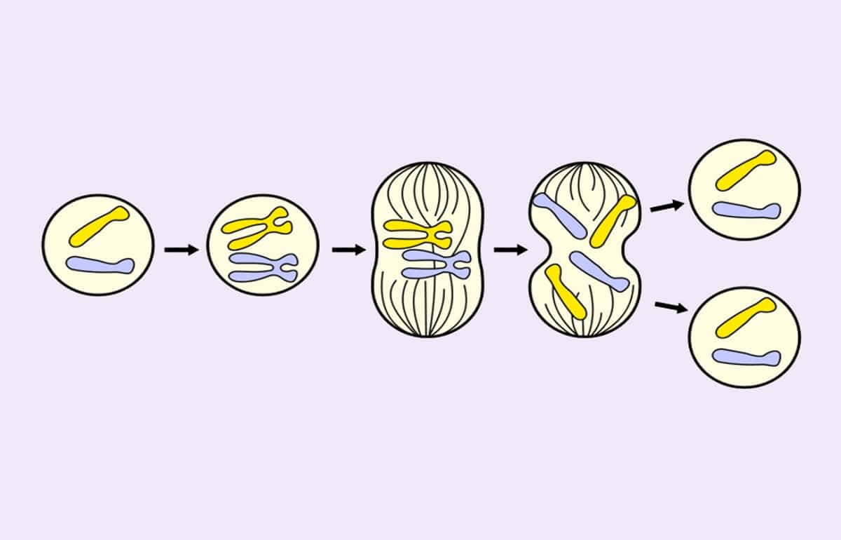 - Anafase: es en donde se produce el reparto de las dos copias de la información genética original, como resultado, los pares de cromosomas se separan, moviéndose a los lados opuestos de las células.