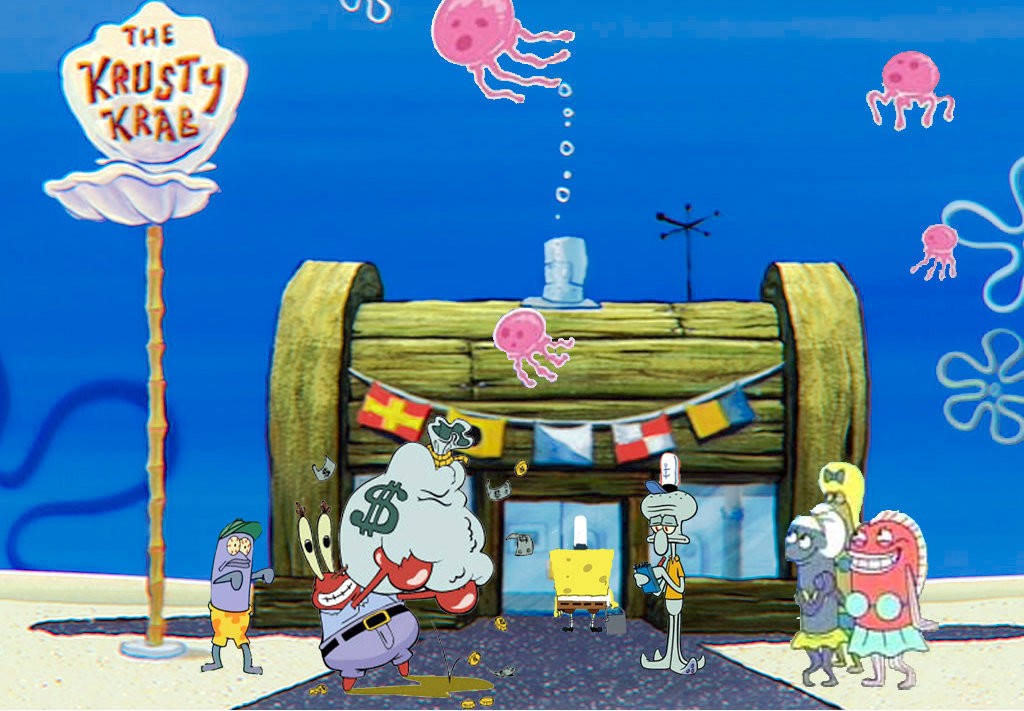 El Crustáceo Crujiente tiene la forma de un cofre con puertas y paredes de vidrio, en la pared de la izquierda, tiene un cartel de Cangre Burguers y unas banderas en el techo, probablemente las banderas de parodias de países terrestres.