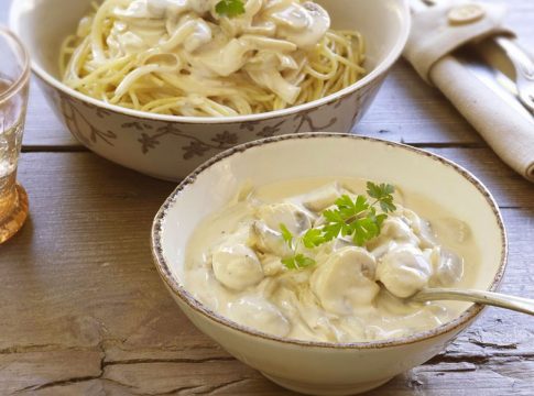 La salsa bechamel con champiñones pareciera ser complicada o muy difícil de realizar, o quizá muy gourmet, pero realmente es fácil de elaborar. Aunque algunas personas suelen utilizarlo con vino blanco lo que le da un sabor diferente, a otras no les gusta este sabor, por lo que se puede reemplazar si lo deseas, por agua o vinagre, además añadiéndole una pizca de azúcar quitando de esta manera la acidez.