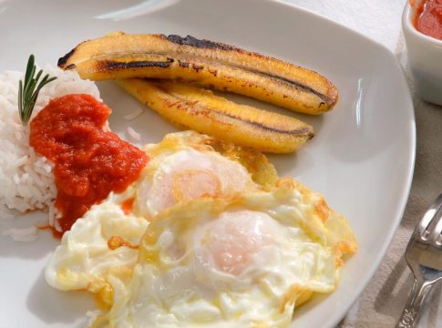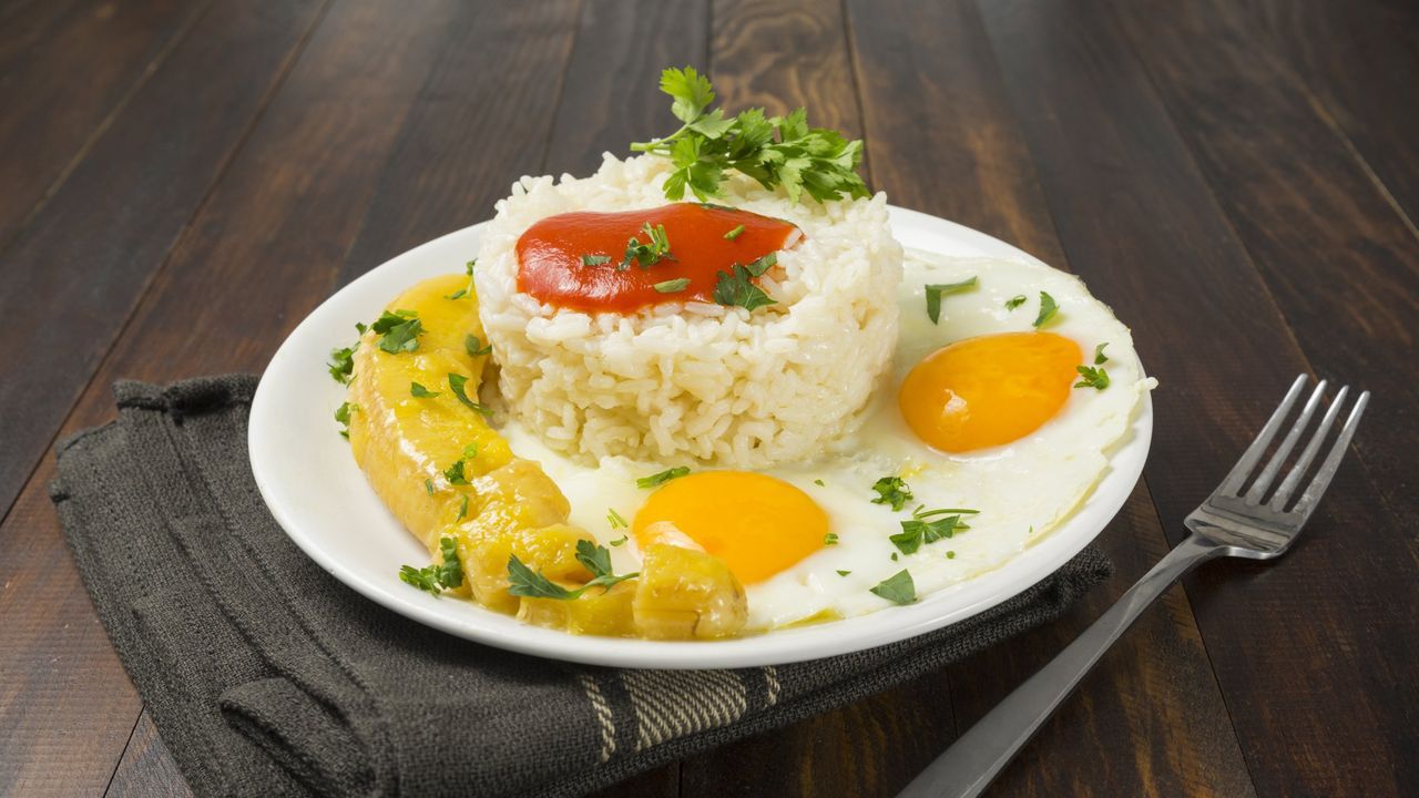 El arroz a la cubana es un plato que consiste en arroz blanco, huevo frito y plátano frito con salsa de tomate. El plátano frito es un ingrediente clave de esta receta que nos recuerda su origen cubano.
