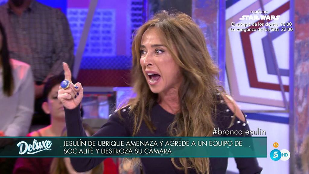 Sálvame Deluxe hablaba la agresión de Jesulín de Ubrique a un equipo de Socialité cuando Diego Arrabal defendió al torero y acusó de provocadores a los periodistas por emitir en directo desde la puerta de su casa. María Patiño saltó como un resorte en defensa de los compañeros de su programa: "Estoy harta de esta gente que viene a provocar. No tienes ni idea del trabajo que hay detrás. Que vengas aquí a tocarme las narices no te lo voy a permitir".