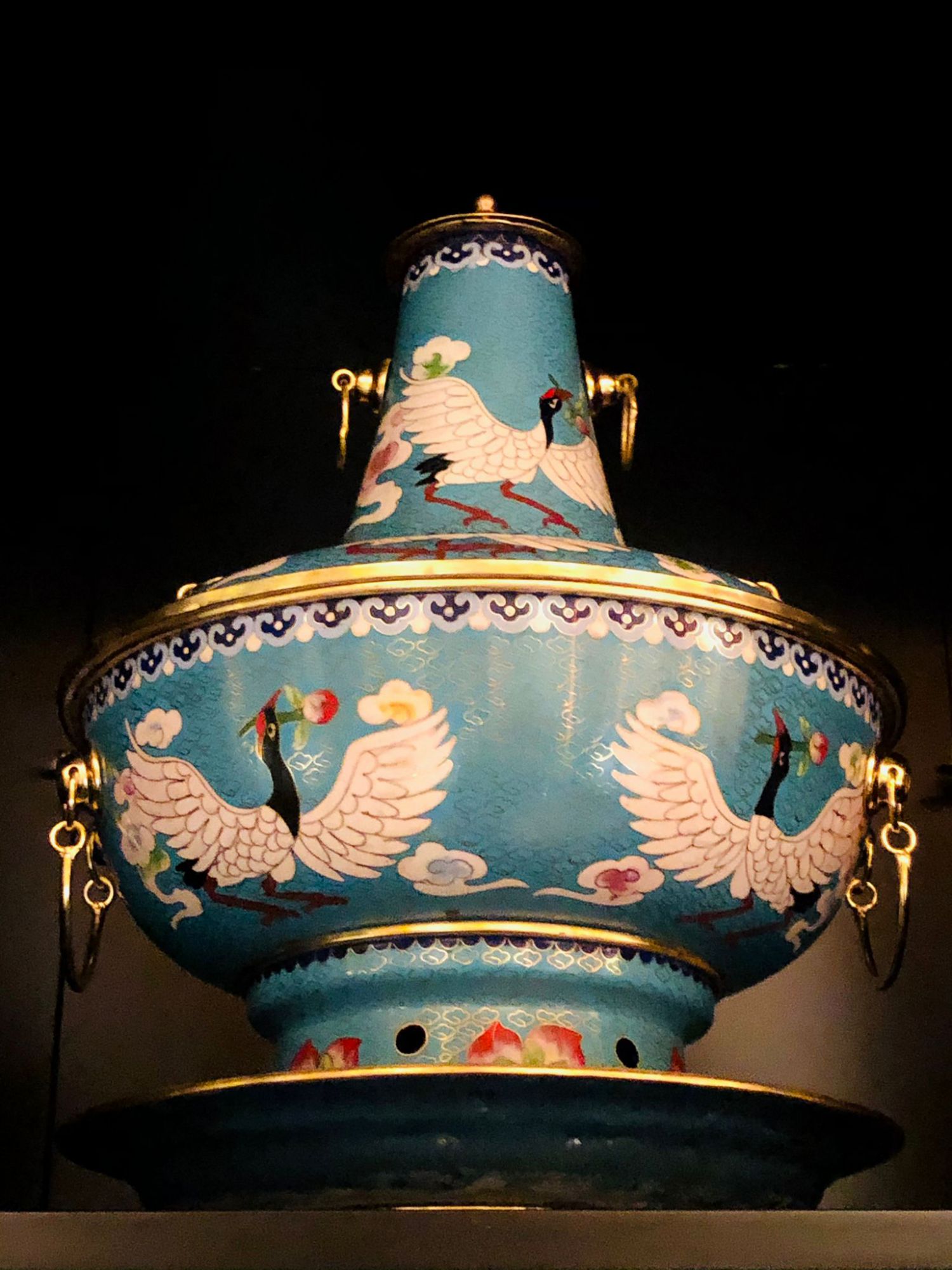 La olla ha ido evolucionando a lo largo de los años, en cuanto a forma y compartimentos, aunque siempre ha mantenido la misma base estética. Está fabricada artesanalmente con alambres de cobre, recubiertos de esmalté cloisonné, una antigua técnica que se utilizaba para decorar utensilios metálicos. Los alambres de cobre se sueldan para formar un patrón y después se cubren con esmalte de varios colores, se hornean, se doran y, por último, se pulen. Esta técnica en China surgió en Beijing, siendo además el lugar de producción más importante. El cloisonné, junto con el jade, el tallado de dientes y el tallado en laca, se consideran “las cuatro técnicas por excelencia de artes y oficios de Beijing”.