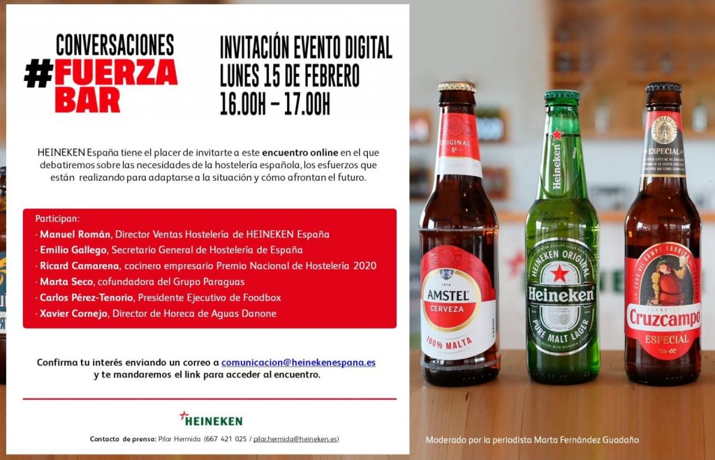 Estos asuntos y los anteriormente mencionados se tratarán en esta nueva mesa/coloquio virtual organizado por Heineken. Será el 15 de febrero, de 16:00 a 17.00h. Email para confirmar: comunicacion@heinekenespana.es.