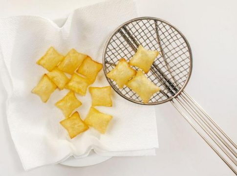Sin embargo ¡sorpresa, sorpresa! Las láminas de patatas se hincharon como globos, ahuecándose en su interior y convirtiéndose en pequeñas burbujas doradas y ligeras. Nunca nadie había imaginado tal sofisticación. Los reyes, entusiasmados, aplaudieron viendo las patatas que se inflaban «como un suflé», y el cocinero pudo respirar tranquilo.