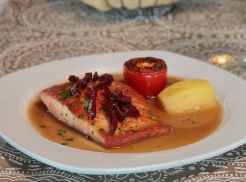 Por último añadimos el salmón y damos un hervor corto a fuego suave, regando la superficie con la salsa. Retiramos del fuego y servimos inmediatamente, acompañando el salmón de un poco de salsa.