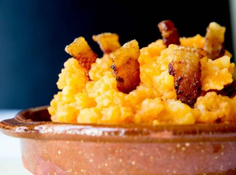 Mezclamos esta salsa con las patatas hechas puré y revolvemos hasta integrar todo. Se coloca en un bol o platos individuales como prefieras y se corona con las tiras de panceta o tocino fritas y doradas. Ya listo para degustar