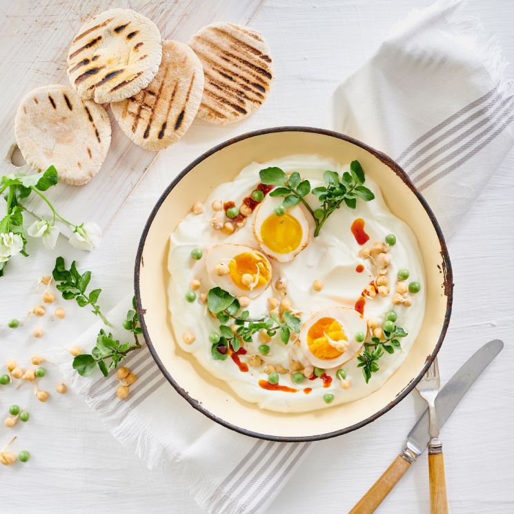 El huevo turco con yogur puede ser ideal para aumentar tu menú de platos e incluirlo en tu dieta, ideal para eventos, fiestas y principalmente para tu desayuno. El yogur griego puede ser de gran aporte para numerosas recetas en proteínas y grasas, siempre y cuando sea azucarado. En esta ocasión, vamos a dar una mezclan con los huevos marinados en sojas junto con una mezcla de hierbas, guisantes y garbanzos.