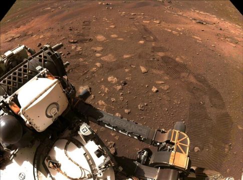 La NASA ha difundido una imagen que muestra las primeras rodadas dejadas por el rover Perseverance en su primeros metros recorridos en la superficie del cráter Jezero de Marte el 4 de marzo.