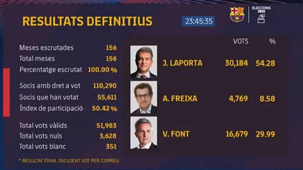 Los resultados de las elecciones presidenciales del Fútbol Club Barcelona, una de las instituciones más ganadoras en toda la historia del balompié mundial, terminaron inclinándose a favor de Joan Laporta i Estruch, mejor conocido por todos en el ámbito deportivo como Joan Laporta o en algunos casos simplemente como Laporta, quien se hizo con el 54% de los votos, superando en esta carrera por el 'Trono de Hierro' que dejó vacante Josep Maria Bartomeu a Víctor Font Manté, el cual obtuvo un 29.99, y a Antoni Freixa i Martí, el cual solamente logró hacerse con el 8.58% de los votos, para de esta manera, marcar la segunda etapa de este abogado español en el combinado veintiséis veces monarca de LaLiga Santander, máxima categoría del balompié del país de piel de toro.