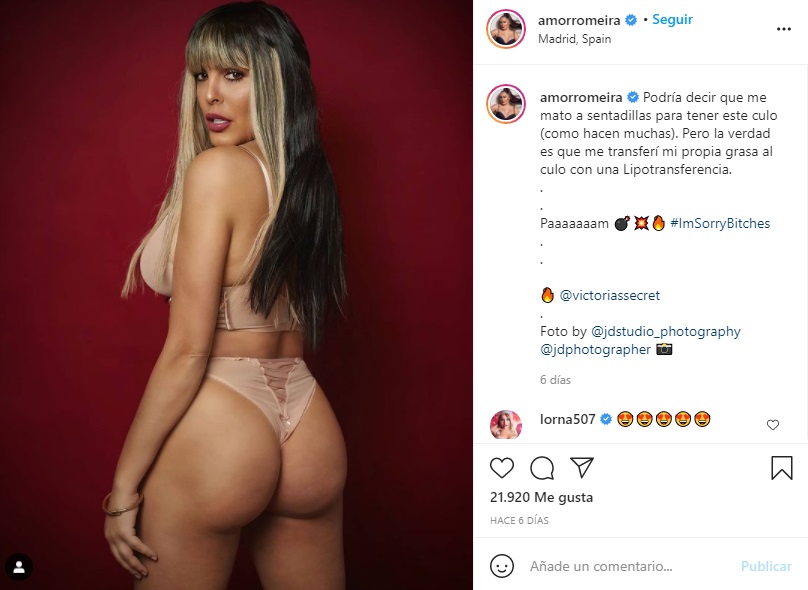 La última operación (hasta el momento) a la que se ha sometido Amor Romeira es a una lipotransferencia para poner una parte de la grasa abdominal que le retiraron en los glúteos. La ex concursante de Gran Hermano ha mostrado muy orgullosa el resultado final poniendo una foto de su culo en Instagram.