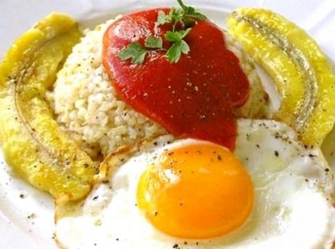 Para esta receta utilizamos 200 gramos de arroz, que ya te enseñaremos a preparar con lujo de detalles; tomates fritos, que es la salsa casera de tomate que también te diremos cómo preparar; un plátano maduro; 2 huevos por persona; sal, ajo y laurel; como ves, ingredientes simples, y el secreto de la receta está en la debida cocción de cada uno de ellos.