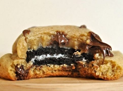 Hacer una masa de galletas con azúcar morena y luego llenarlas con muchos chocolates pequeños de preferencia personal y una vez que termines tu masa, vas a emparedar galletas Oreo entre dos piezas de masa para galletas, ya que pues, la otra será el centro de sabor aparte para la combinación de los excelentes sabores de tu preparación.