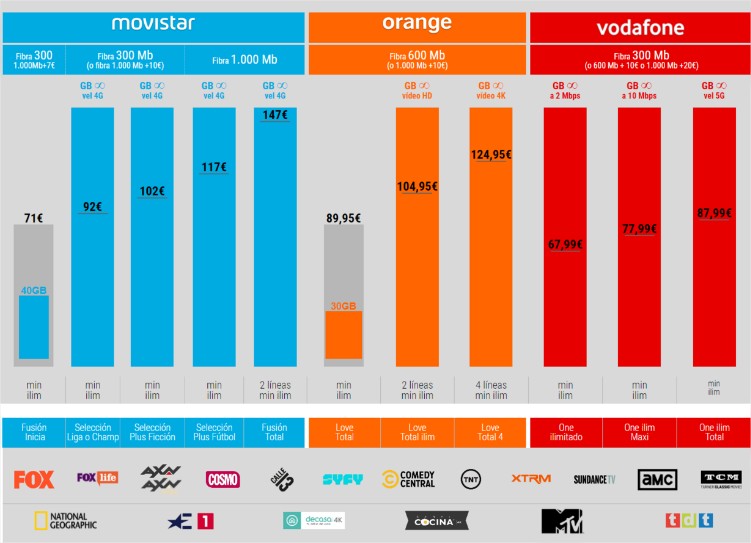 Para los usuarios que estén buscando una oferta combinada entre fibra, móvil y televisión tienen donde elegir entre Movistar y Orange para tener acceso a contenido de fútbol, y Vodafone por otro lado puede ser el más barato de todos. En este 2021 Movistar ha añadido en su plataforma unas novedades como Atresplayer y Mitele Plus, mientras que Orange ha agregado Universal+ y Dreamworks.