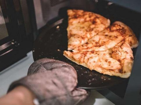 Es la práctica más común, pero esto no la convierte en la más indicada, ya que la masa queda blanda y los ingredientes se resecan. Pero claro, conocemos el truco de poner la pizza en un plato y meterla dentro del microondas con un vaso de agua lleno a la mitad para evitar que se resequen los alimentos.