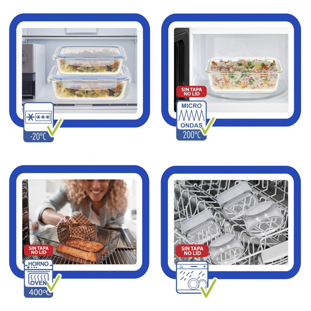 Este pack de 6 recipientes de vidrio y cierre hermético son perfectos tanto para conservar los alimentos en la nevera o el congelador como para llevarlos al trabajo, a la playa o donde vayamos. Están fabricados con un cristal especial resistente a los golpes accidentales. También pueden introducirse en el microondas a una temperatura máxima de 200 grados.