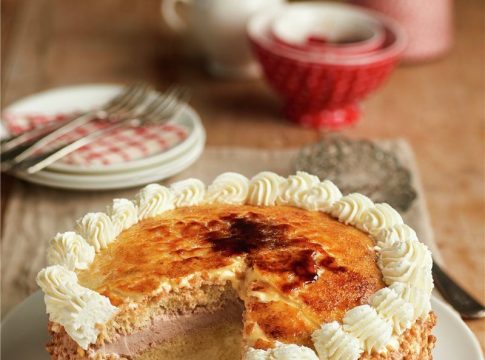 - Tapamos con el último bizcocho, calamos con más almíbar y cubrimos los laterales con un poco de la nata montada. El resto lo metemos en una manga pastelera con una boquilla rizada. Cubrimos la superficie con una fina capa de yema. Espolvoreamos con azúcar y tostamos ligeramente con un soplete.