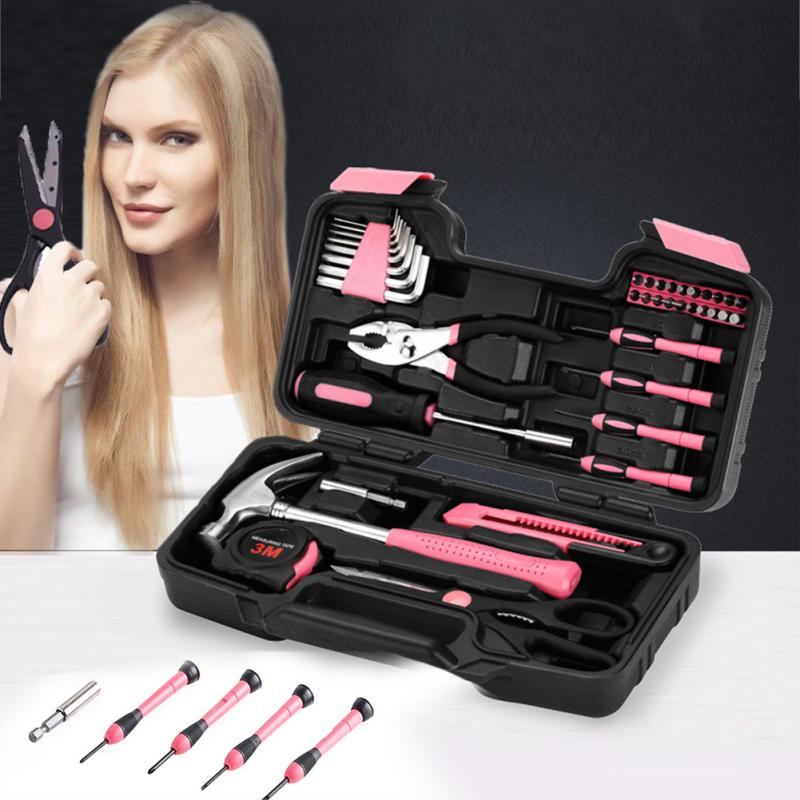 8KIT DE HERRAMIENTAS DE MANO PARA EL HOGAR, CAJA CON ESTUCHE DE ALMACENAMIENTO DURO, COLOR ROSA, 39 PIEZAS