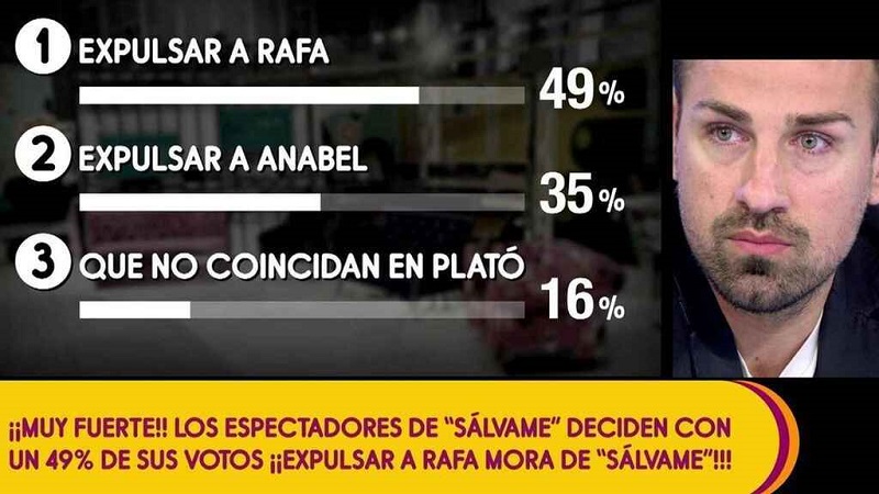 Tras la discusión, la dirección de Sálvame realizó una encuesta para guiarse en la decisión que iban a tomar. El público se decantó masivamente para que expulsaran a Rafa Mora con casi el 50% de los votos. Pero parece que esto va a quedar en agua de borrajas, ya que el valenciano lleva toda la semana victimizándose para que no le despidan.