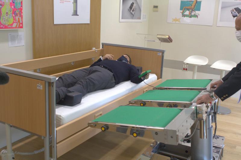Así, la camilla COBY-1 permite recoger al paciente de la cama para trasladarlo a quirófano o donde sea necesario. En este sentido, la camilla puede poner al paciente en la mesa de operaciones y más tarde recogerlo de nuevo como el cirujano lo dejó, para después llevarlo a su cama automáticamente con la única asistencia de una persona.