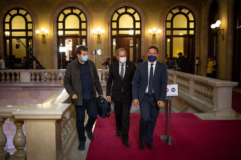 Torra ha llegado antes de comenzar el pleno y está previsto que Mas y Junqueras lleguen más tarde, y seguirán la sesión desde una sala contigua al hemiciclo para garantizar las medidas sanitarias, ya que el Salón de Sesiones está todo ocupado por los diputados, que se distribuyen entre los escaños y los palcos que habitualmente se reserva para los invitados y las autoridades.