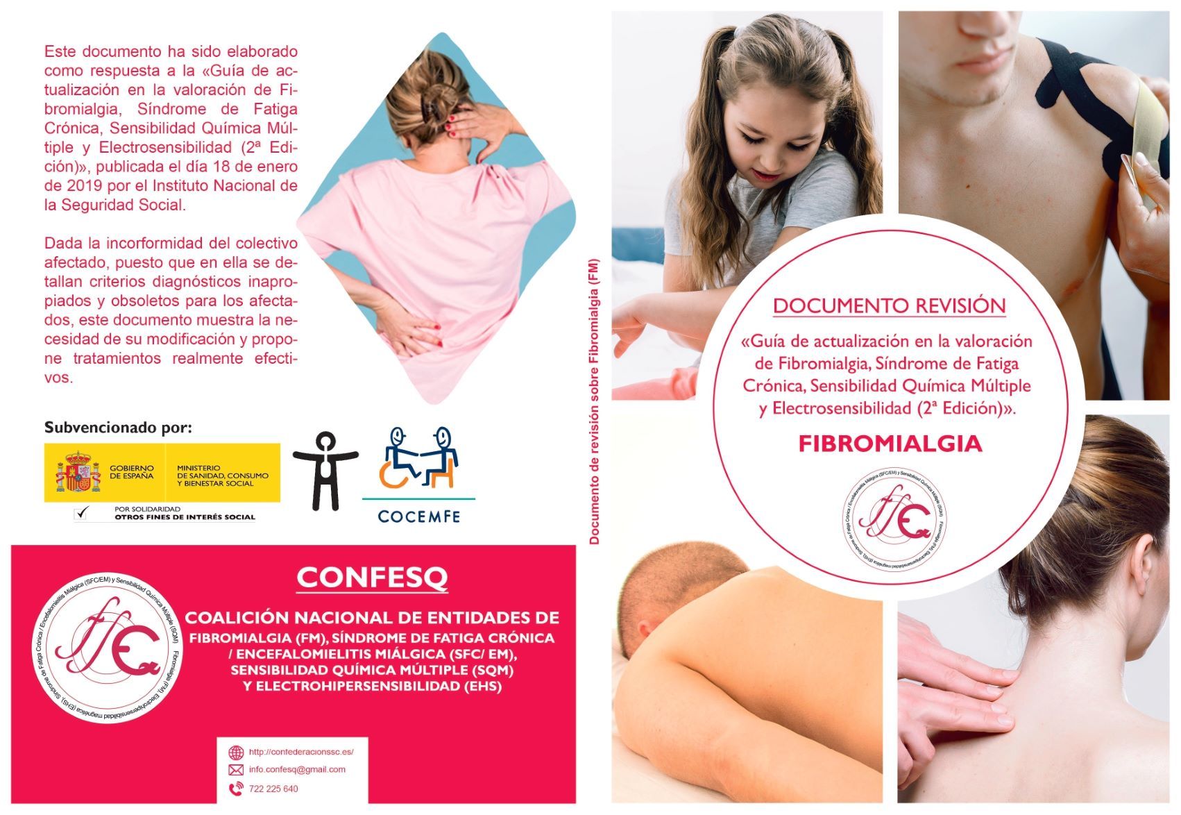 Sin embargo, los pacientes sí han realizado lo que les invitó a hacer la entonces Directora General del INSS, elaborando cinco documentos de revisión. Los tres primeros, Sesgo de Género, Encefalomielitis Miálgica / Síndrome de Fatiga Crónica y Sensibilidad Química Múltiple ya han sido publicados. Hoy se presenta el Documento de Revisión de Fibromialgia. En él se revisa la guía elaborada por el INSS para esta enfermedad punto a punto, fundamentando las afirmaciones que se presentan con la bibliografía e investigaciones más actualizadas. El documento ha sido escrito con la participación de 7 asociaciones y federaciones pertenecientes a CONFESQ y revisado por los doctores Joaquim Fernández Solá, Jorge Antolín Ramírez Tejero, Antonio Martínez Lara, Javier León Iglesias, Rosa Magallón y Ana Mª García Quintana.