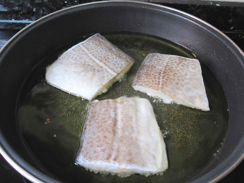 Los filetes tienes que colocarlos con la piel boca arriba para que no se deshagan. Deja que se confiten durante 4 minutos y cuando transcurra ese tiempo dales la vuelta. Cuando los tengas colocados boca abajo, mueve un poco la sartén o cazuela para que el bacalao suelte su gelatina. Después de que pasen otros 4 minutos, sácalos del fuego.