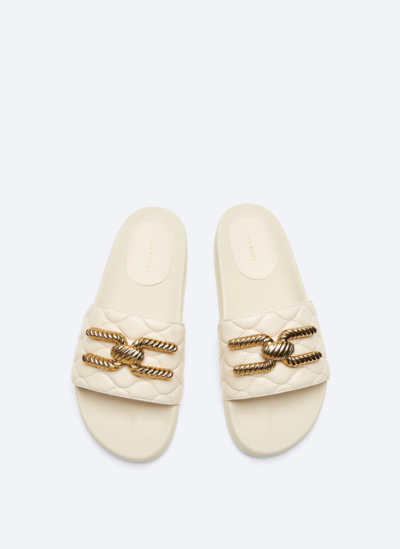 Comodidad y buen gusto vuelven a darse la mano en Uterqüe en este modelo de sandalias planas tipo bio acolchadas y con adorno. Su piel también ha sido curtida de manera sostenible y son un modelo perfecto para verano por su comodidad.
