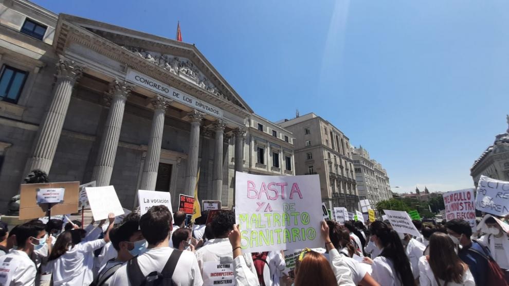 Durante el recorrido se ha realizado una parada frente al Congreso de los Diputados, donde el convocante, la Confederación Estatal de Sindicatos Médicos (CESM), ha convocado a los portavoces de todos los grupos parlamentarios para recoger en persona el documento en el que se explica en qué consiste el conflicto, las principales reivindicaciones que se están haciendo a Sanidad y donde se pide su participación para ayudar a encontrar una solución consensuada que permita asegurar una elección con garantías.