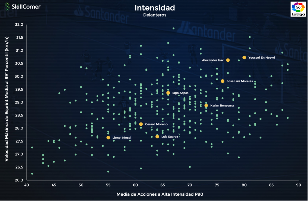 Además de esto, la prestigiosa empresa de análisis ha comparado el nivel de intensidad física de los máximos goleadores de La Liga, obteniendo datos muy elocuentes. SkillCorner determinó que Youssef En-Nesyri y Alexander Isak fueron los dos atacantes más intensos de La Liga. El delantero del Sevilla, de hecho, ha superado en esta faceta al resto de máximos realizadores del continente europeo.
