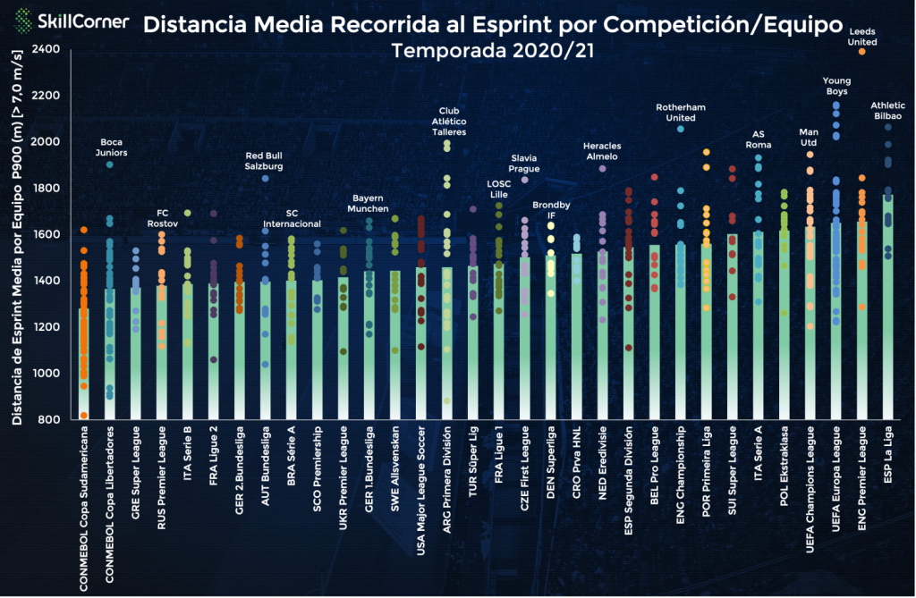 El big data no miente, y la liga con más intensidad física ha sido este año la española. Teniendo en cuenta los datos que SkillCorner ha recabado la última temporada de hasta 32 competiciones de fútbol distintas, La Liga posee las cifras más altas en cuanto a distancia media de esprints. Estos datos sugieren, por tanto, que el español fue el campeonato que más intensidad exigió a sus equipos.