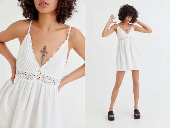Es un modelo de tirantes con detalle de puntilla, escote de pico y goma en la cintura. Si eres de los que compra en tiendas físicas tenemos una mala noticia para ti: solo está disponible en la web de la marca de retail. Puedes elegir entre el gris o el blanco.