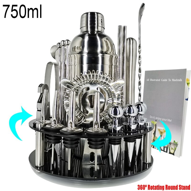 Este juego de coctelera viene incluido con un sin fin de utensilios y un estante giratorio por el precio de 31,64€ además de contar con un envío de 10 días si resides en España. Es un juego de cóctel que llama mucho la atención debido al acabado en color plata que hace que parezca de lujo. Es un juego perfecto para tener en la cocina ya que no pasará desapercibido.
