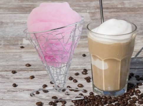 3.- Vierte el café en el vaso que contiene la leche de coco y decora el vaso con un poco de algodón dulce rosa.