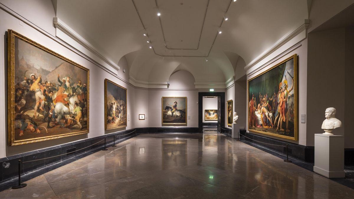 Tras un recorrido por las pinturas murales al óleo que ocuparon dos habitaciones de la llamada 'Quinta del Sordo', que Goya había comprado en 1819, las 'Pinturas negras', y por otras obras de sus años finales, el visitante se adentra en la sala 64 con obras realizadas durante las dos primeras décadas del siglo XIX, una época marcada en España por la crisis política y bélica derivada de la expansión napoleónica, que enfrenta el 2 y 3 de mayo de Goya a 'La muerte de Viriato, jefe de los lusitanos' de José de Madrazo, junto a su boceto, obra marcada por el canon neoclasicista