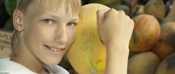 young boy choose a melon at the market