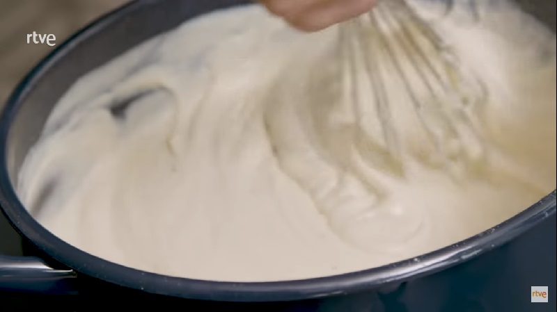 Tienes que continuar removiendo hasta que la masa se despegue de las paredes de la cazuela. En ese momento, retíralo del fuego. Ahora vamos a preparar el relleno de las croquetas, por lo que tienes que cortar el queso de tetilla en cubos finos y añadírselo a la masa.