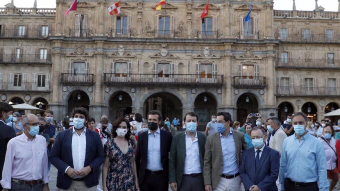 Casado se reunió anoche con los presidentes autonómicos de su partido, con los que se dejó ver por las calles de Salamanca. Alberto Núñez Feijóo, Isabel Díaz Ayuso, Juan Manuel Moreno Bonilla, Alfonso Fernández Mañueco, Fernando López Miras y Juan Jesús Vivas encabezaron una comitiva 'popular' que paseó por el centro de la ciudad antes de acabar cenando en un restaurante de la Plaza Mayor.