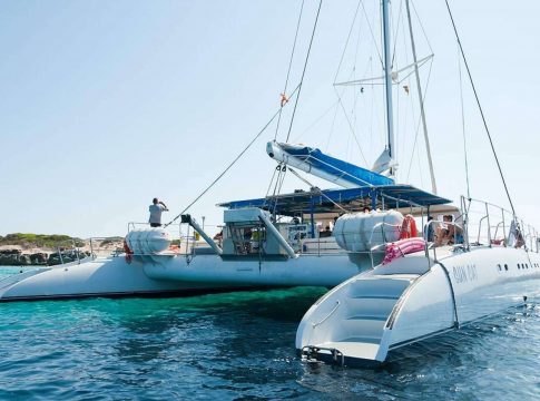 Para grupos más grandes que buscan una embarcación más divertida y fresca, Yacht IN Ibiza ofrecen 3 Catamaranes, uno de ellos con capacidad hasta para 100 personas, perfecto para disfrutar de un día de sol. Además, cuenta con una gran red en la proa que permite a los pasajeros sumergirse en el mar y practicar deportes acuáticos. Se puede alquilar durante medio día en la mañana, por la tarde con la puesta de sol, o bien para un día completo.