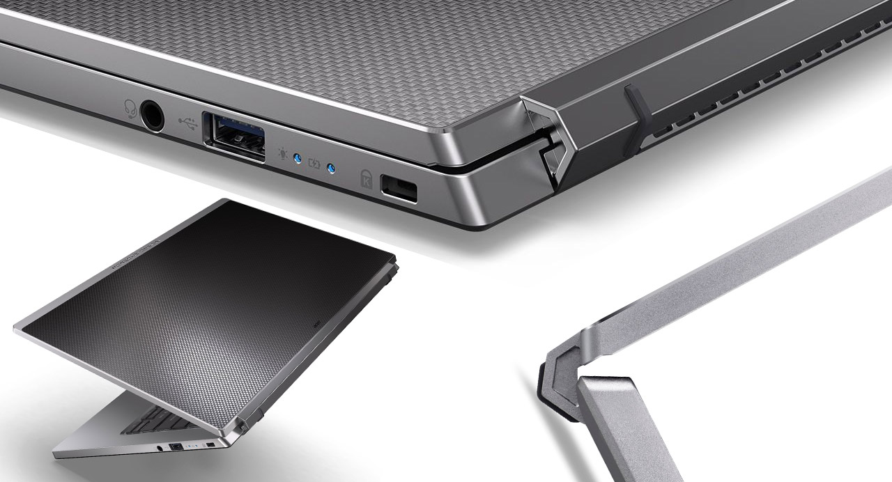 Con un peso de 1,2 kg y 16 mm de grosor, este portátil destaca por los materiales por los que la compañía ha apostado. Algunos dispositivos simulan la fibra de carbono, pero este en concreto si cuenta con una cubierta de fibra de carbono 3K cortada con diamante.