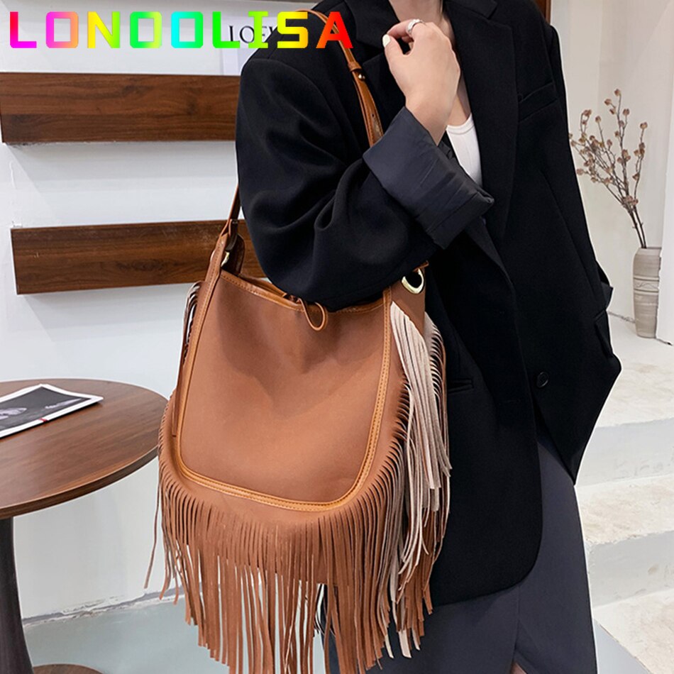 Este es un bolso de estilo casual, tiene 32 cm de ancho por 32 cm de alto y 15 cm de ancho. Puedes elegir entre la versión marrón, negro o blanco. Los laterales y la parte inferior llevan flecos del mismo material que el bolso. Puede llevarlo colgado al hombro o en bandolera. Puedes comprarlo rebajado por 21,66 euros directamente aquí.