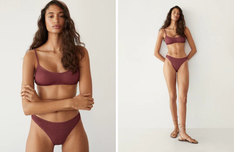 El siguiente bikini de Mango es este fruncido con textura, que le da relieve a la tela. El tejido es elástico y cuenta con tirantes finos ajustables para adaptarse a la medida de tus pechos. Este conjunto marrón es perfecto para resaltar el moreno de tu piel.
