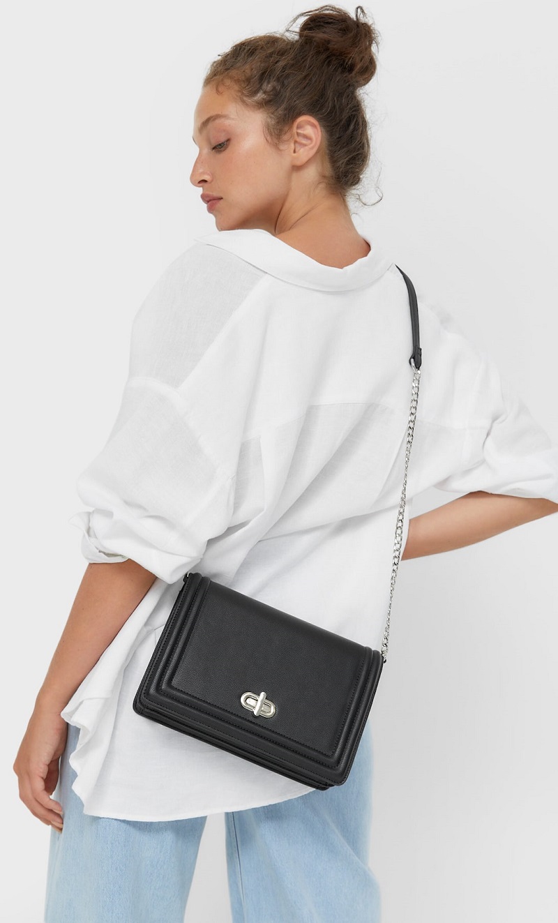 Otra opción para la nueva temporada es esta sencilla bandolera negra con cierre. Puedes combinarla con camisas blancas o tops básicos de colores claros para que destaque sobre ellos. Cuenta con un asa en forma de cadena para que puedas colgártelo del hombro y llevarlo de manera muy cómoda.